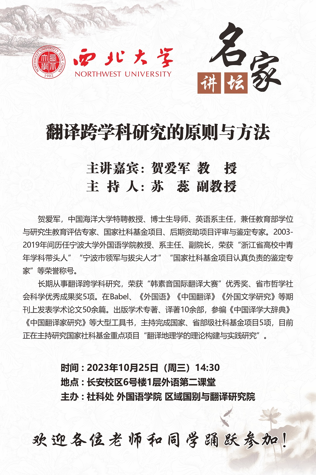 Professor He Aijun has been engaged in interdisciplinary translation research for many years and has received awards such as the Excellent Prize in the Han Suyin International Translation Contest and five provincial and municipal awards for outstanding achievements in philosophy and social sciences. He has published over 50 academic papers in journals like Babel, Journal of Foreign Languages, Chinese Translators Journal, and Foreign Literature Studies. He has also authored or translated more than 10 academic monographs and participated in the compilation of major reference works such as the A Dictionary of Translation Studies in China and Translators Through Chinese History. He has led or completed five national and provincial-level social science fund projects and is currently leading a key project funded by the National Social Science Fund titled “Theoretical Construction and Practical Research of Translation Geography”
